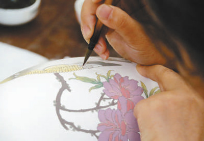 新世纪陶瓷艺术馆工作人员绘制釉下五彩瓷。本报记者申智林摄