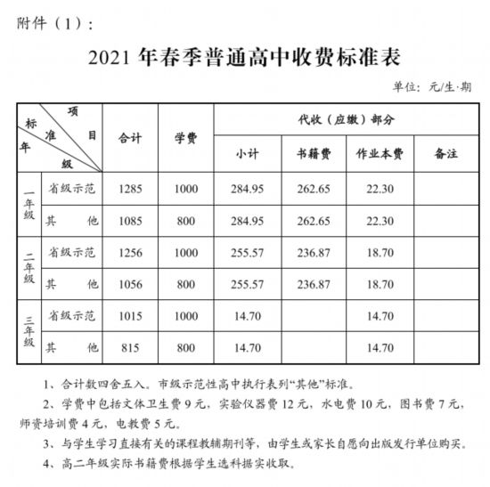 此外,高中的教材教辅价格也有所变化。高中由于适应高考要求进行课改,使教材数量变化,影响书籍费变化。高一年级教材费比2020年春增加8.93元,高二年级则减少16.37元;义务教育阶段教材费因省调整价格略有调整,如小学一年级道德与法治下册2020年春季为5.09元,2021年春季为5.32元,增加0.23元;增加书籍也使书价总价上升,如小学五年级2020年春季223.8元,2021年春增加了“人工智能教育”和“语文素养读本”(区教育局增设,由区财政出资),书价总费用为271.8元,增加48元。(记者 吴颖姝)