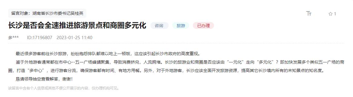 针对网友提出的是否会全速推进商圈多元化问题,长沙市文化旅游广电局、商务局回复称,推进商圈培育建设已列入长沙创建国际消费中心城市任务清单。