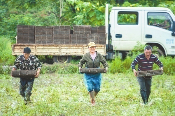 7月1日,娄底市娄星区杉山镇同安村,村民在搬运晚稻秧盘。洪涝灾害过后,当地干部职工、群众齐心协力开展灾后重建和生产自救。吴永华 摄