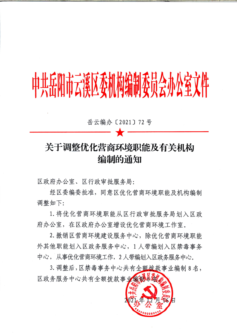 关于调整优化营商环境职能及有关机构编制的通知(岳云编办〔2021〕72号)