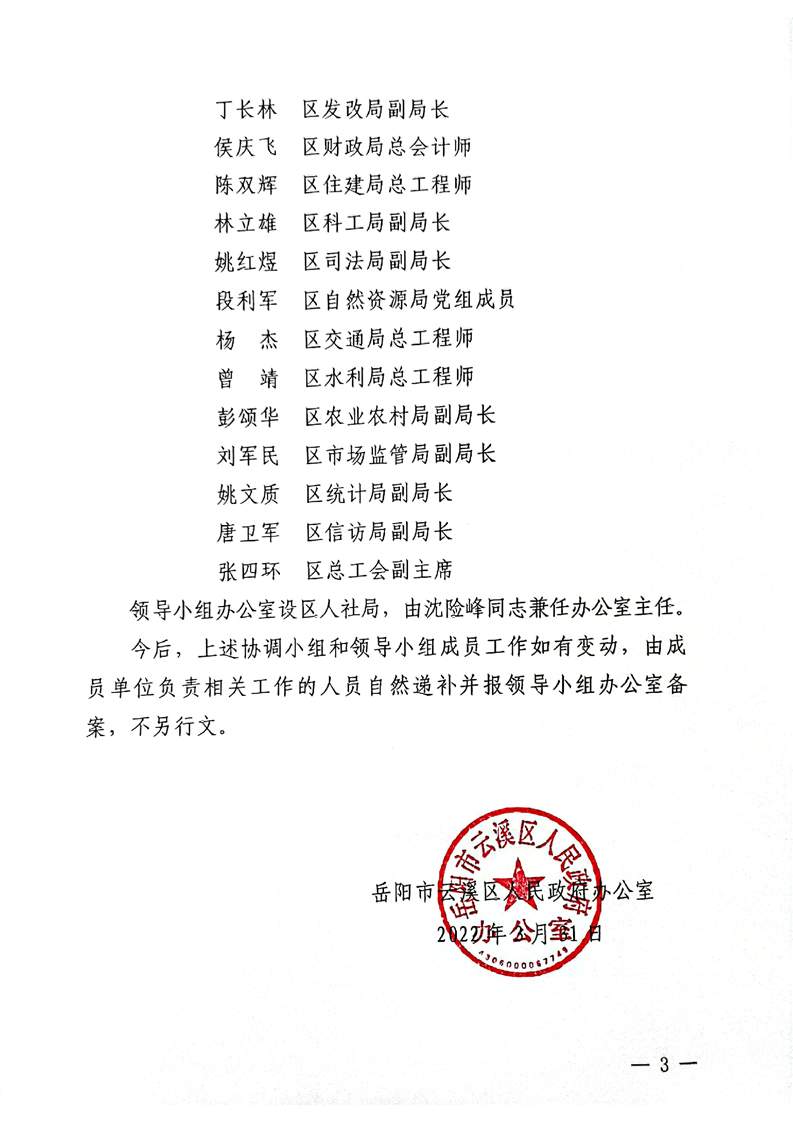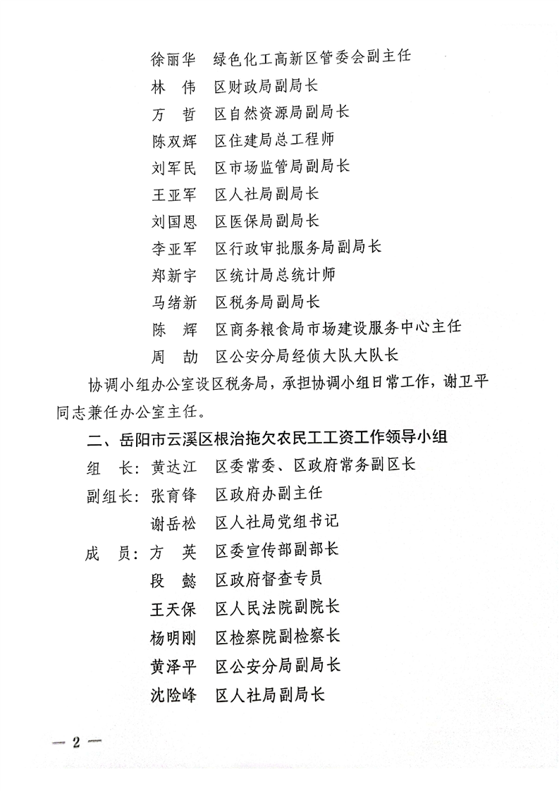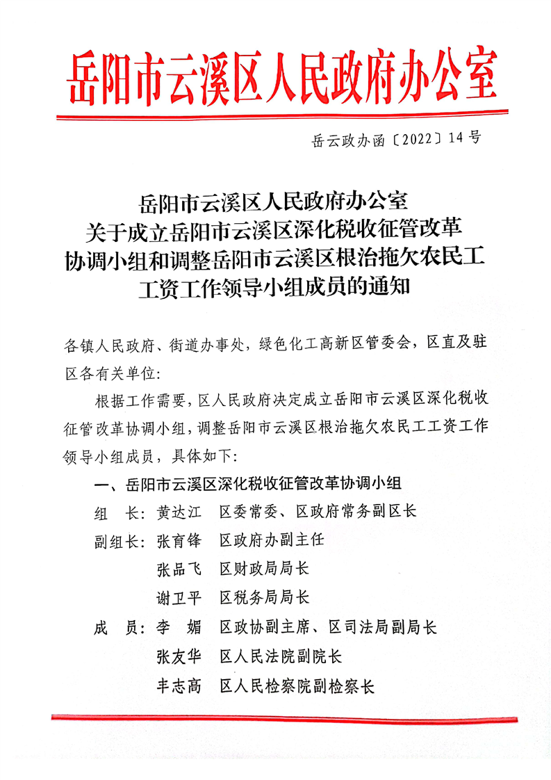 区政府办关于成立岳阳市云溪区深化税收征管改革协调小组和调整岳阳市云溪区根治拖欠农民工工资工作领导小组成员的通知