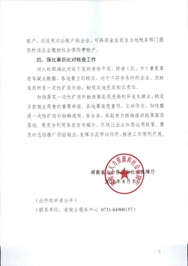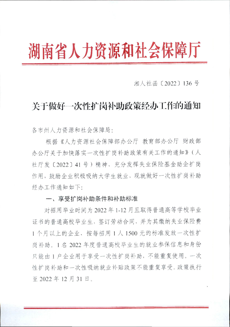 省人社厅关于做好一次性扩岗补助政策经办工作的通知(湘人社函(2022)136号)
