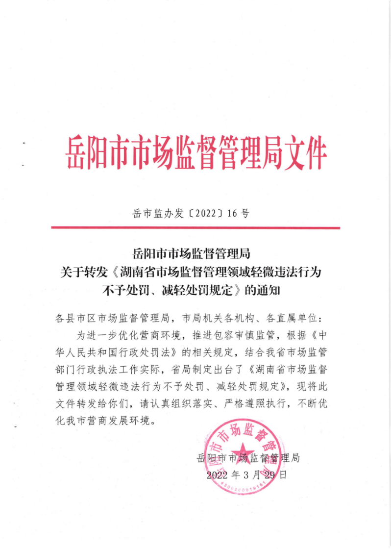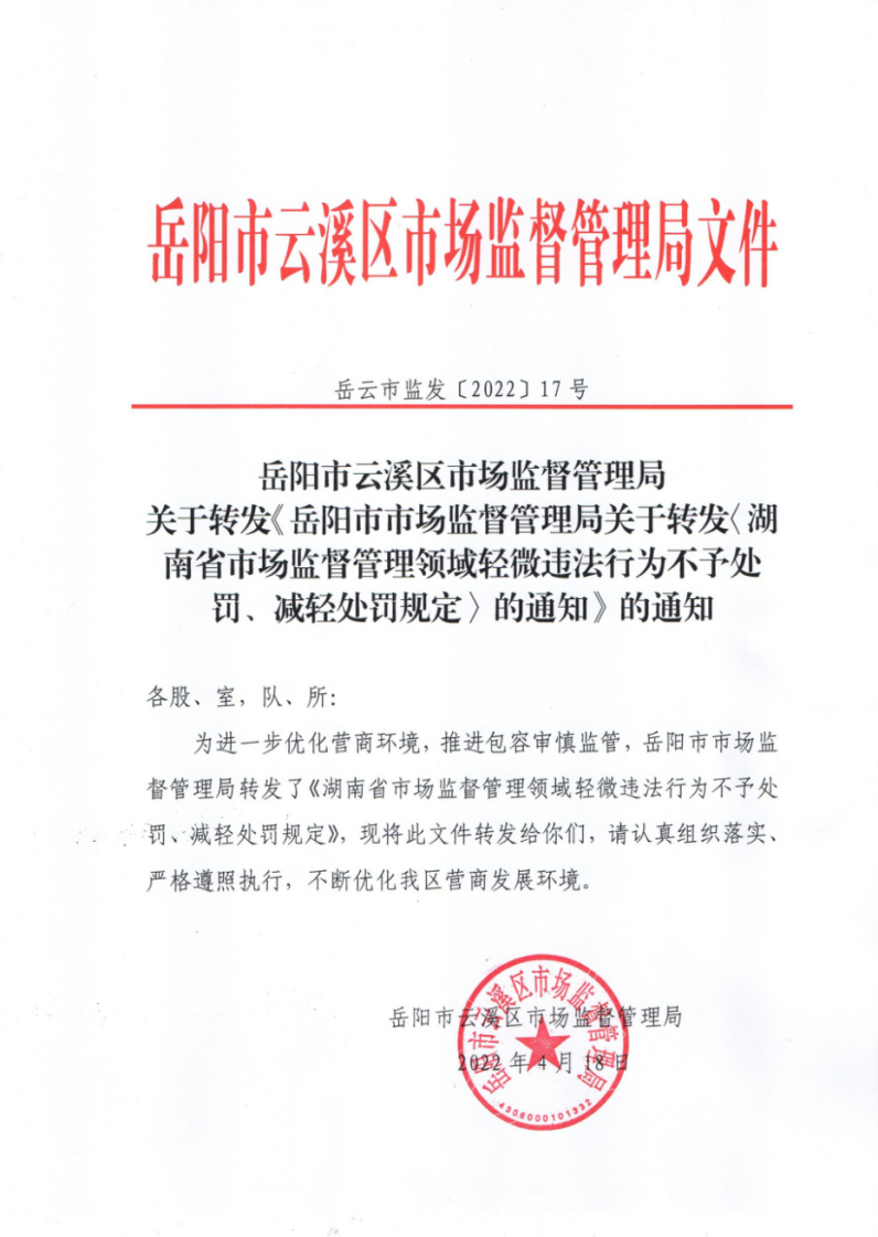 区市场监管局关于转发《岳阳市市场监督管理局关于转发〈湖南省市场监督管理领域轻微违法行为不予处罚、减轻处罚规定〉的通知》的通知