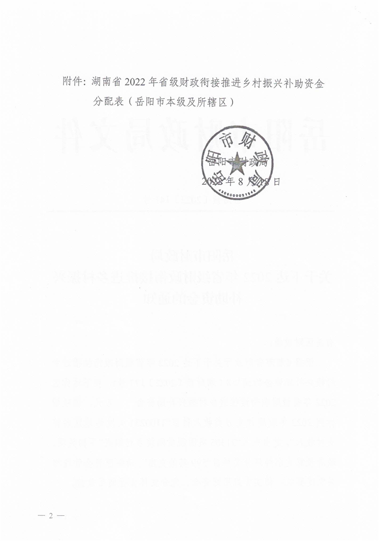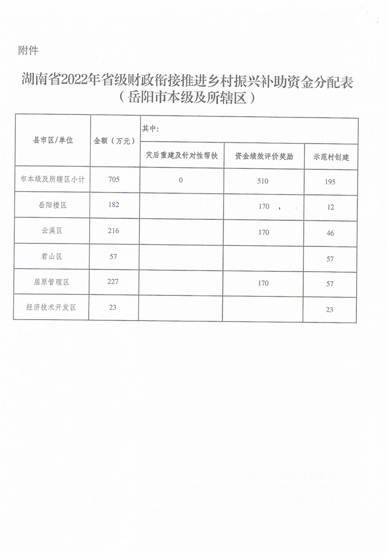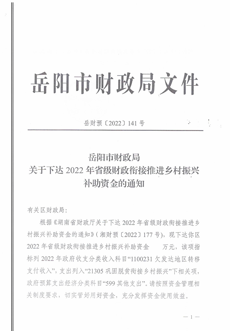 市财政局关于下达2022年省级财政衔接推进乡村振兴补助资金的通知(岳财预〔2022〕141号)