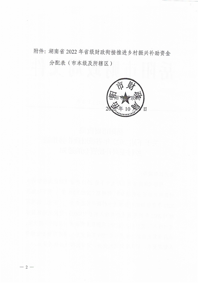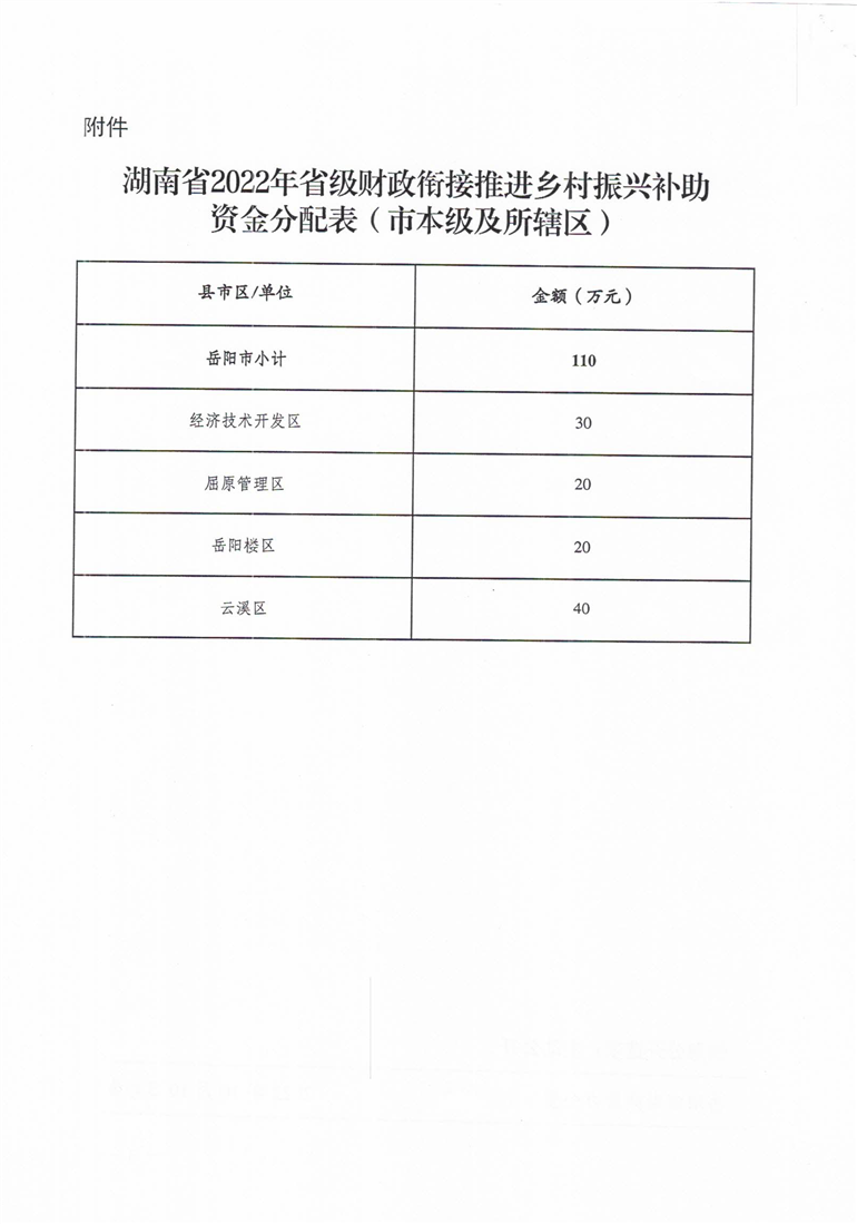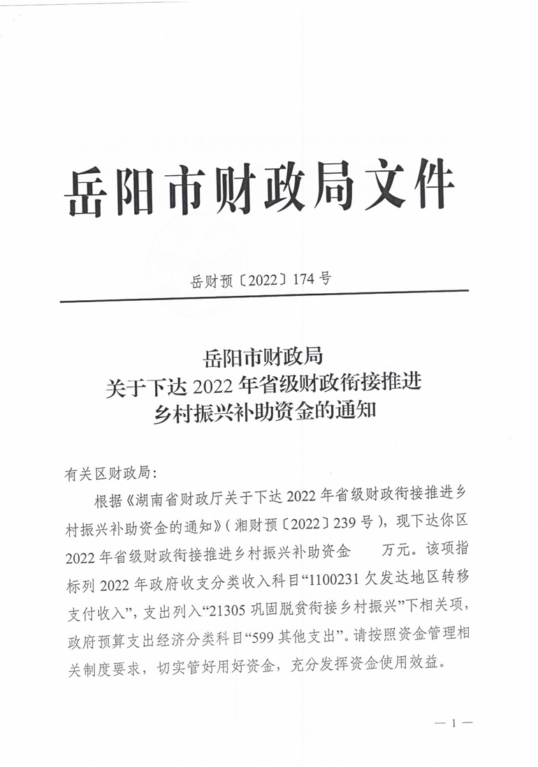 市财政局关于下达2022年省级财政衔接推进乡村振兴补助资金的通知(岳财预〔2022〕174号)