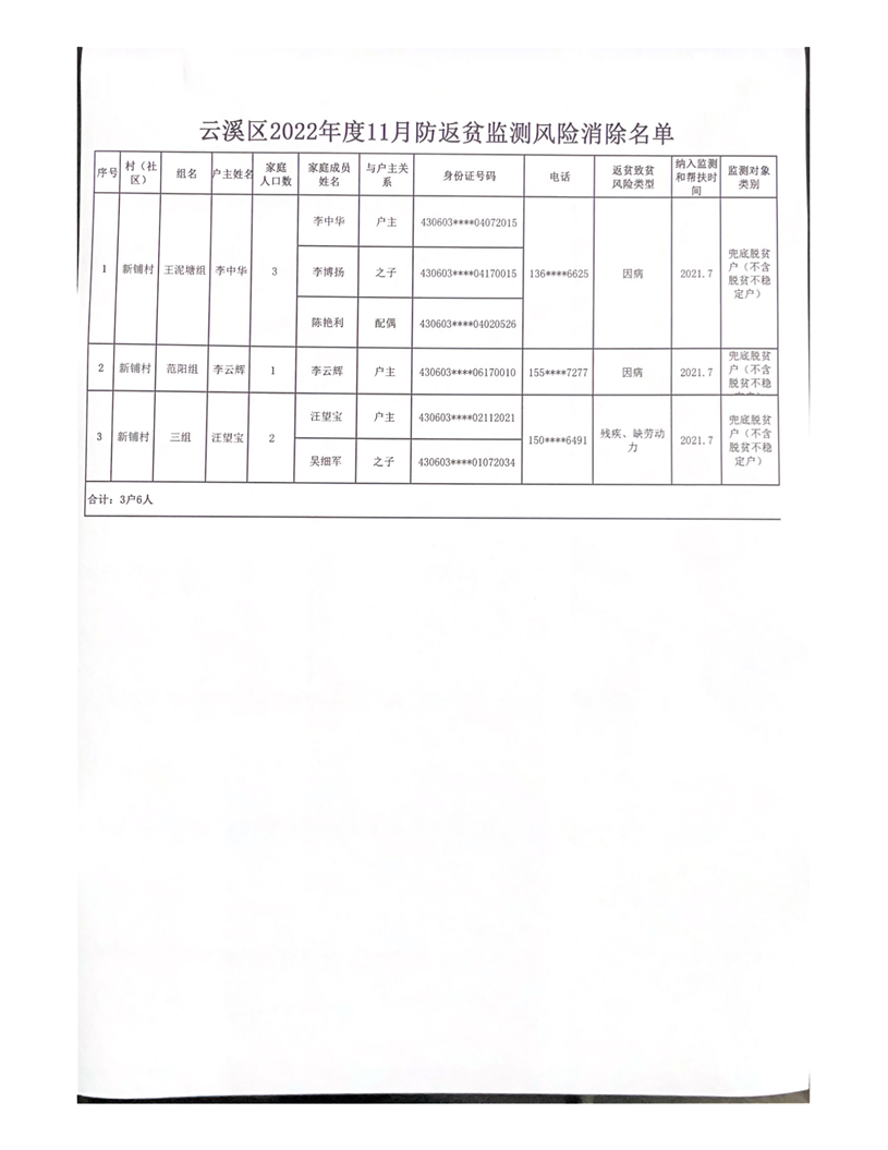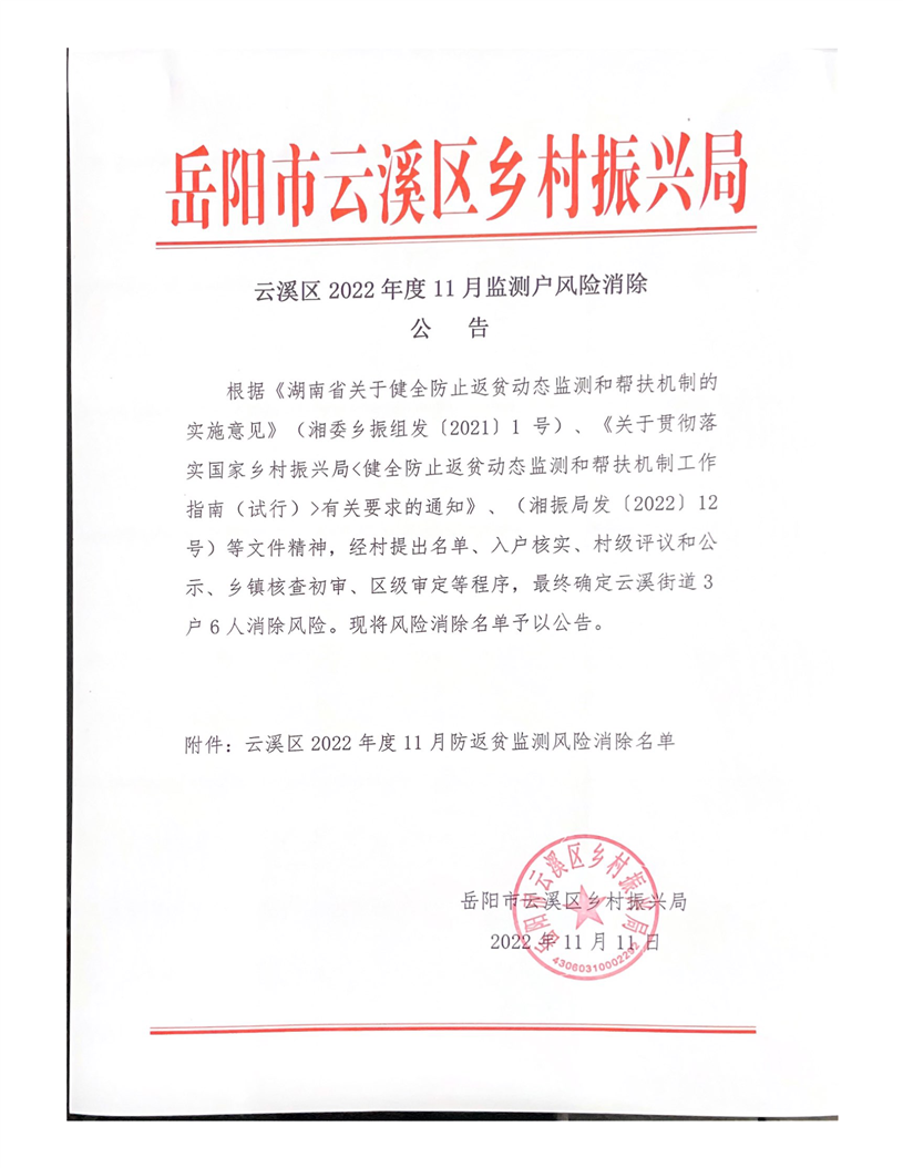 云溪区2022年度11月监测户风险消除公告