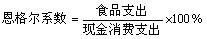 恩格尔系数 指食品支出在现金消费支出中所占的比例。计算公式为: